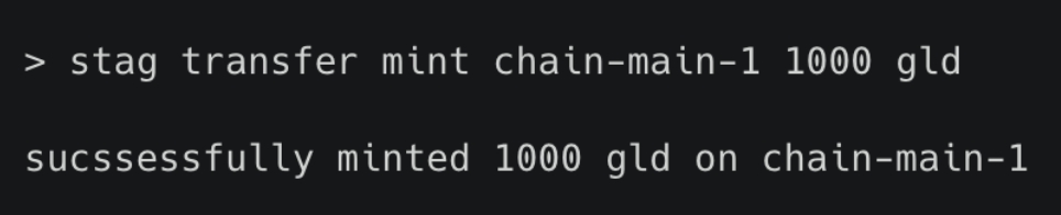 $ stag transfer mint <chain_id> <amount> <denom>. We will mint 1,000 GLD tokens as an example, allowing us to perform the