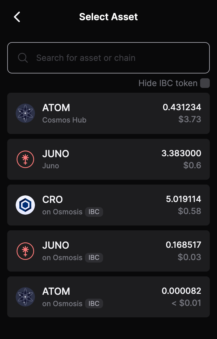 2. Search ATOM or Cosmos under "Asset", select "IBC Send" then click Cronos POS.                    &#x20;