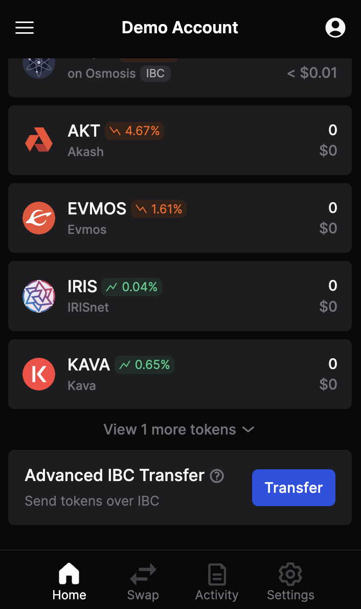 Navigate back to the wallet account page, scroll down to the bottom and hit "Transfer" for Advanced IBC Transfer.&#x20;